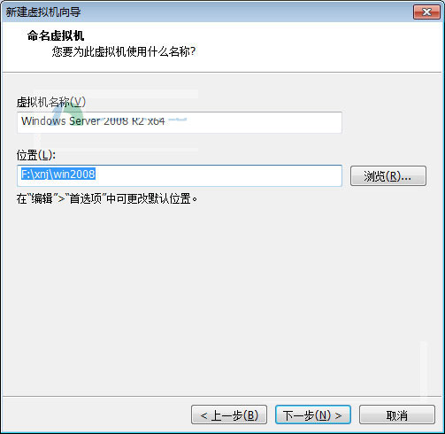 7、设定虚拟机名称,以及安装的位置【F:\xnj\win2008】,小编所有的虚拟系统都放在F:\xnj文件夹下,所以自然建了一个win2008;