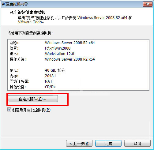 9、为了能够让win2008 r2更好的运行,点击自定义硬件,可以对硬件进行更改;